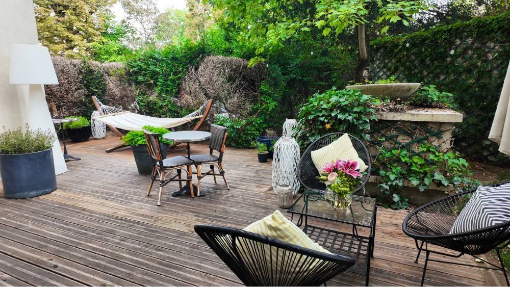 • La terrasse du jardin, plus spacieuse, parfaite pour partager un apéritif entre amis, admirer les beaux paysages environnants et se laisser bercer par l’ambiance paisible des lieux.